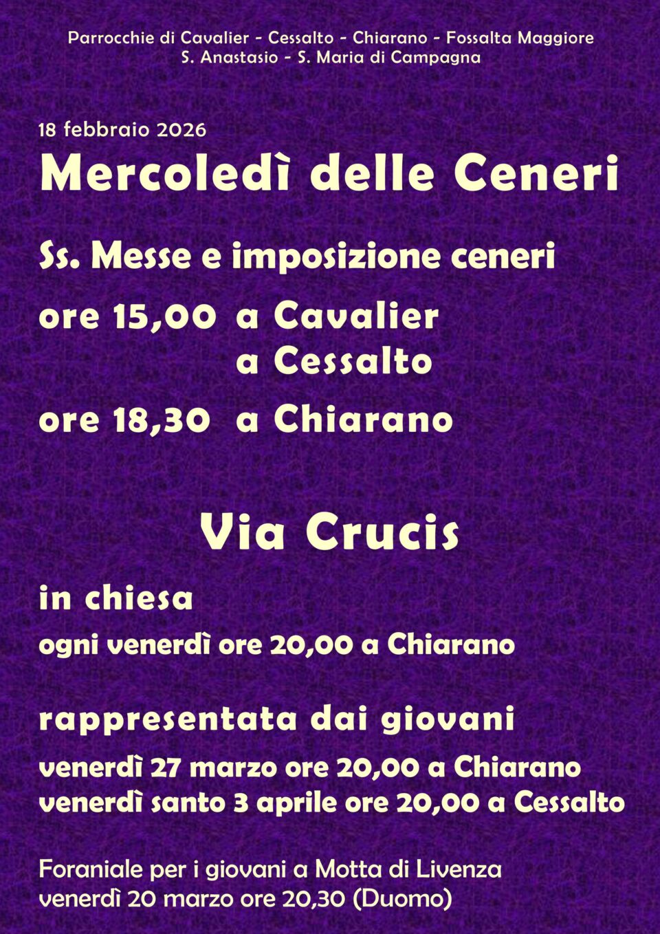 Il sito “parrocchie unità pastorale chiarano” raccoglie le informazioni riguardanti le parrocchie di Chiarano, Fossalta Maggiore, Cavalier, Cessalto, Santa Maria di Campagna, Sant’Anastasio, Campo di Pietra e Arzeri.